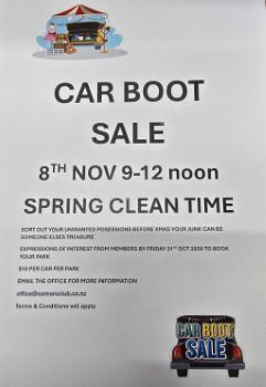 CAR BOOT SALE: Saturday 8th November (next weekend) from 9am until 12 midday. If you are wanting to bring your unwanted items and clear some space for Xmas then contact the office and register your name. $ 10.00 per park, open to everyone. T&Cs apply