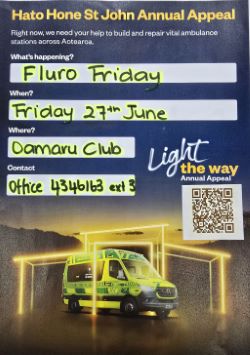 PROUD TO BE PARTICIPATING IN FLURO FRIDAY, COME ON OAMARU let's get behind St John Oamaru and build them a much-needed Station. All money raised here will stay in Oamaru for our station new build. We will at some stage need these fantastic people, whether it be for ourselves, family, friends or neighbours, so come down to the Club, 27th June and enjoy the fundraising festivities.