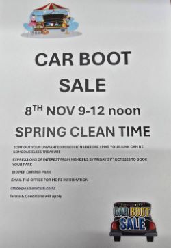 CAR BOOT SALE: Saturday 8th November (next weekend) from 9am until 12 midday. If you are wanting to bring your unwanted items and clear some space for Xmas then contact the office and register your name. $ 10.00 per park, open to everyone. T&Cs apply